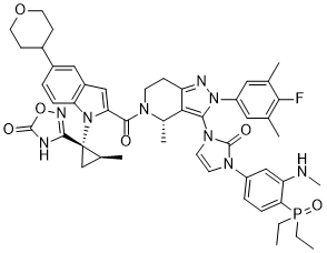 3-((1S,2S)-1-(2-((S)-3-(3-(4-(Diethylphosphoryl)-3-(methylamino)phenyl)-2-oxo-2,3-dihydro-1H-imidazol-1-yl)-2-(4-fluoro-3,5-dimethylphenyl)-4-methyl-4,5,6,7-tetrahydro-2H-pyrazolo[4,3-c]pyridine-5-carbonyl)-5-(tetrahydro-2H-pyran-4-yl)-1H-indol-1-yl)-2-methylcyclopropyl)-1,2,4-oxadiazol-5(4H)-one |